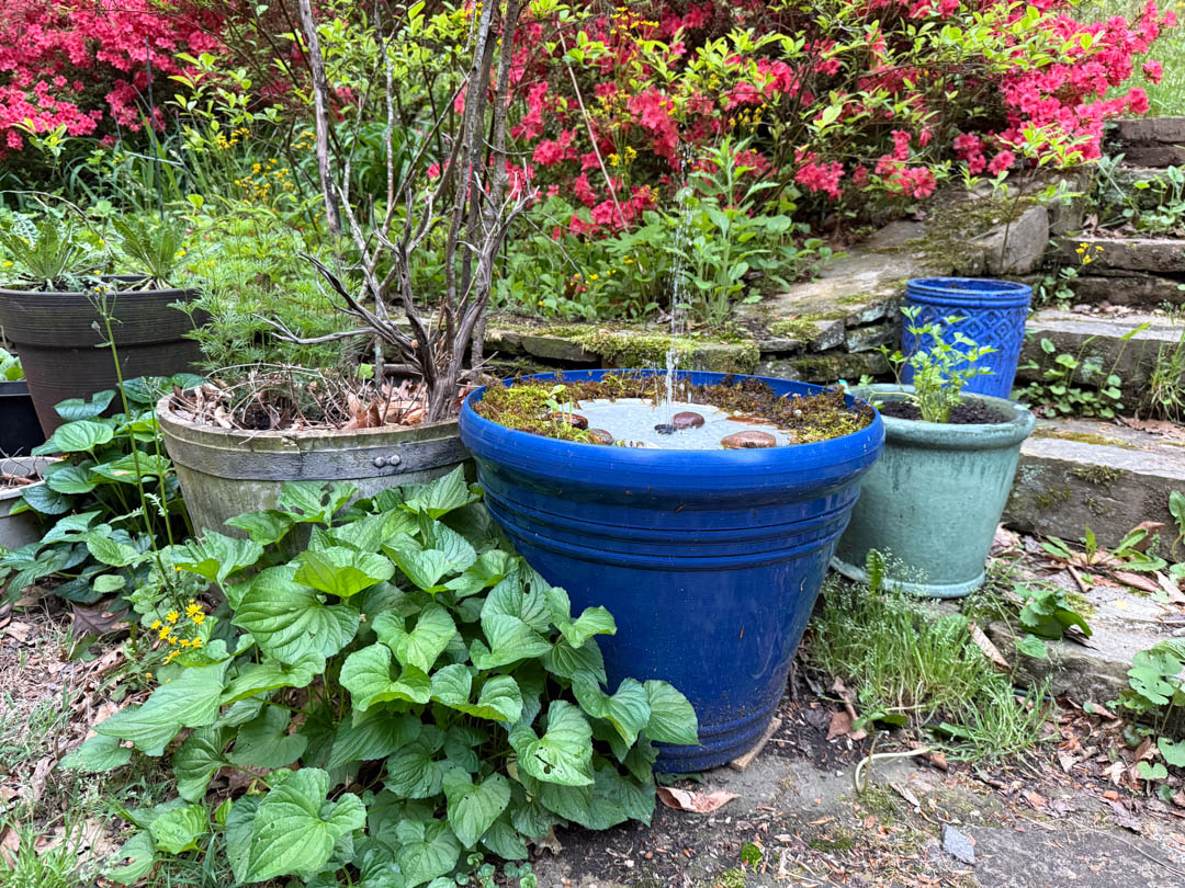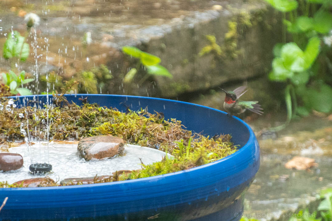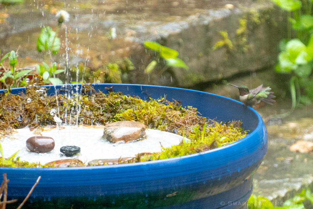 After a lot of trial and error, I’ve finally perfected my hummingbird water park! I’m on version 3, here to tell you what I’ve learned to save you from making the same mistakes. Wondering what a hummingbird water park is and why you would want to make one? A hummingbird water park consists of very shallow water on top of a tray with a spray of water in the middle. Unlike a solar fountain that needs sun to work, and often throws all of the water outside of the bird bath, this hummingbird water park runs constantly, no matter the weather because it is powered by a small pond pump, plugged into an outlet. Hummingbirds LOVE dashing through mist or water spray, and love a nice cool shower. They sit down on the wet rocks, and even get right in the water for a bath. I watch a male hummingbird use the fountain every morning, multiple times. He seems to love it, using it over and over again starting when it’s first getting light outside. It is a joy to watch!! They can be seen several times each day sitting on the rim of the pot, with water spraying on and around them. And as a bonus, warblers and other birds are attracted to the sound and often come to investigate, get a drink, or even take a bath. It’s a very fun, and pretty inexpensive way to attract more birds.
