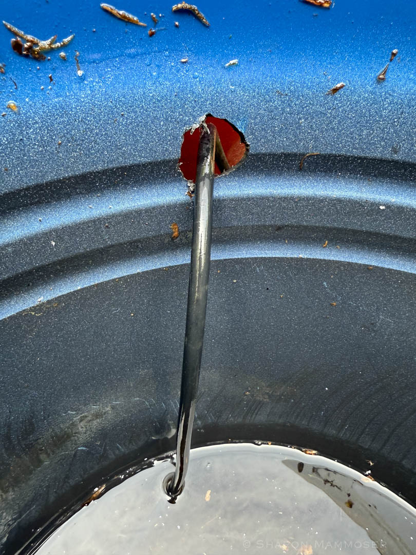- Using a drill, make a hole near the top of the pot, about two inches from the top. This needs to be just big enough so the pond pump power cord can emerge from the hole and plug into the extension cord. Don’t make it a lot larger than it needs to be or you will have mosquitoes laying eggs in the pot water. If you make it too big, use a bunch of steel wool to fill the hole and prevent mosquitoes from entering the pot.