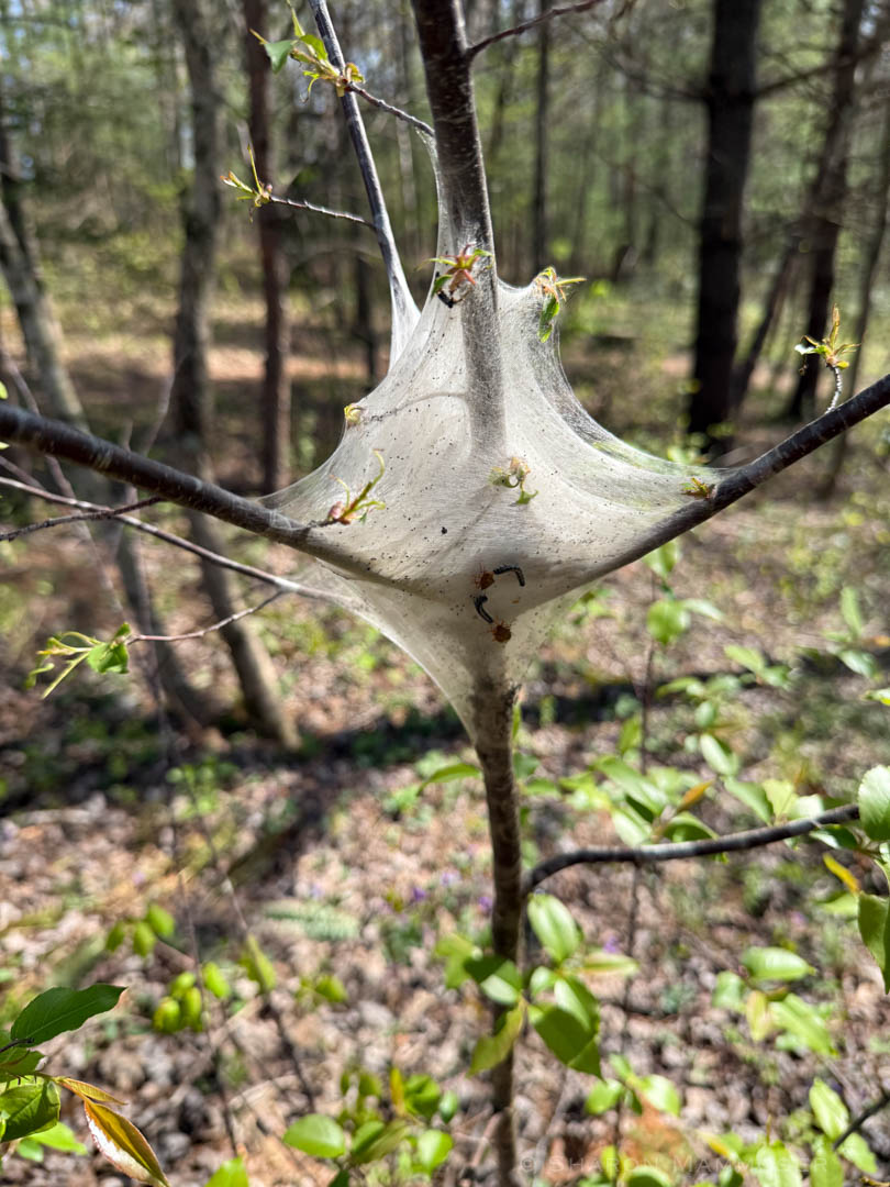 As you hike or drive around, you’ve probably seen those white, silken tents in many trees. They are super easy to spot, especially since the forest has not fully leafed out yet and they aren’t camouflaged by leaves. Most of us know these are from some kind of caterpillar, but that might be the end of our knowledge about this seasonal phenomenon. If you have these tents in trees in your yard, do you need to be panicking or running to the store for some kind of pesticide?