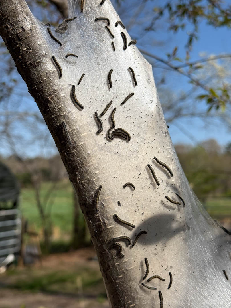Here’s what you need to know about these tent caterpillars. They are made by eastern tent caterpillars, which are a native species to eastern North America. Their white nests are always in a crotch or fork of trees– never on the ends, and not in the fall. Those are made by another species of caterpillar– the fall webworm. Unlike many other species of caterpillars that have multiple generations per summer, the eastern tent caterpillar has only ONE. The eggs have been there all winter, and now, in early spring, the tiny caterpillars hatch out and begin feeding. Each egg mass has between 150-350 caterpillars. They are particularly fond of cherry, crabapple, apple, plum and chokecherry leaves. They will exit the tent to feed, leaving a trail of silk to help them find their way back. They return to the tent at night for safety from predators, although some birds are onto the game and dig into the tent to snag lots of tasty treats all at once.