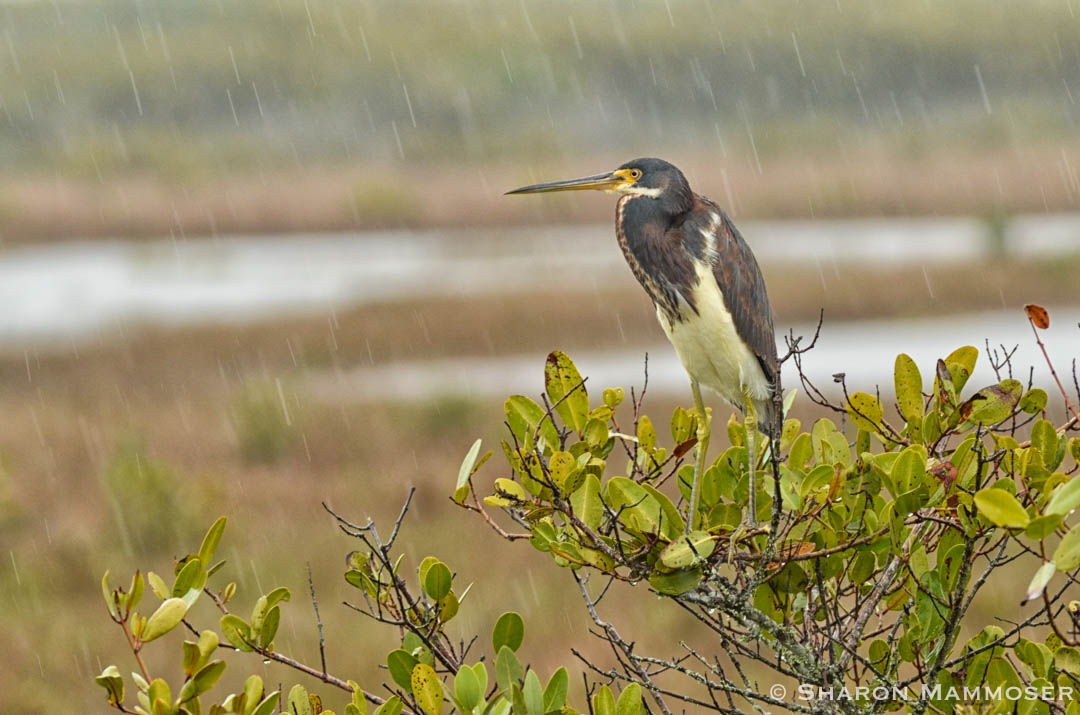 A tri-colored heron in the rain.