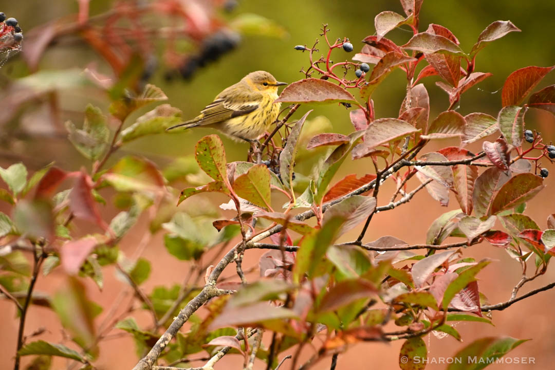 A warbler in a fall yard