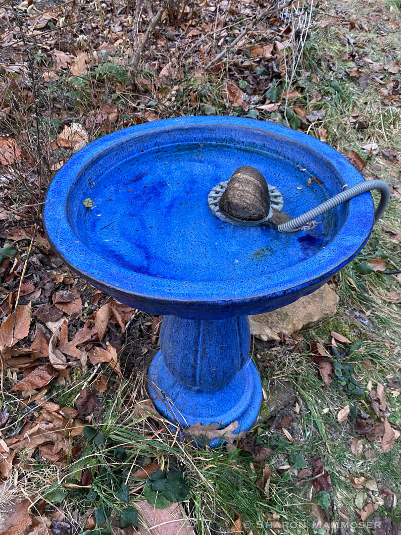 Like every animal on the planet, birds require water, even in the winter. If you have food but no water, the birds will have to go elsewhere for water and might not spend time in your yard. Offer water in a variety of ways– shallow bird baths, deeper baths, spray fountains, etc. In winter it’s possible to offer water even though it’s often below 32 degrees– just invest in a bird bath warmer. This is a device you can place in a deeper bird bath and it prevents the water from freezing. You can find them at specialty bird feeding stores like Wild Birds Unlimited or online–most cost less than $50. (Check out some birds using my homemade water fountain!  Directions for making this here.)