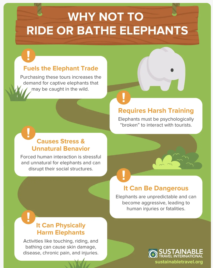 According to Sustainable International Travel.org, “Interactive elephant experiences like riding, bathing, and posing for selfies may appear benign, but there is often a history of harm behind these activities. World Animal Protection’s Senior Campaigns Manager, Liz Cabrera Holtz, warns that “making elephants engage in unnatural activities, like being bathed by a human or being painted on, requires intensive abusive training.